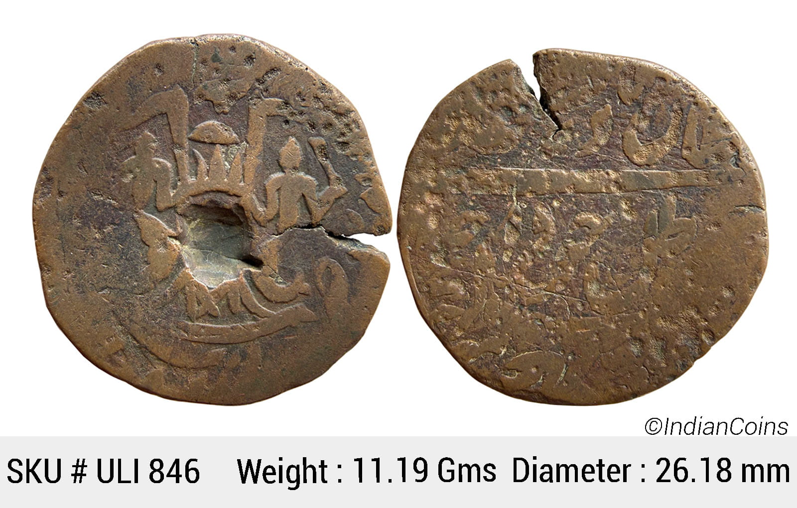 Indian Princely States, Awadh State, Wajid Ali Shah (AH 1263-1272, 1847-1856 AD), Copper Falus, 11.19 gms, 26.18 mm, Bait-us-Sultanat Lakhnau Mulk Awadh Akhtarnagar Mint, KM # 351.3, multiple flan crack & test mark overall fine, very scarce. ULI 846